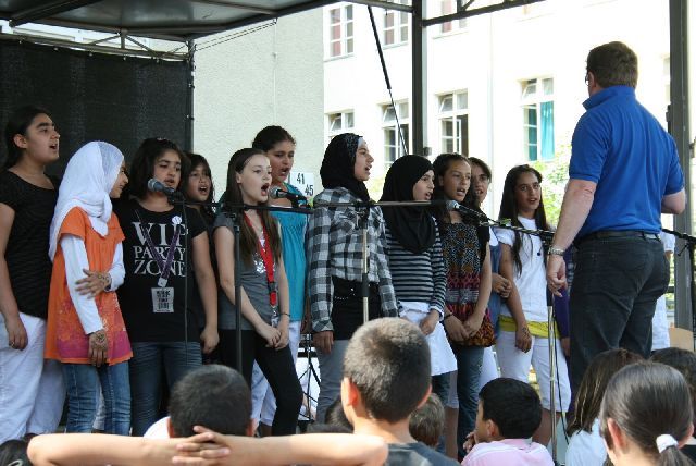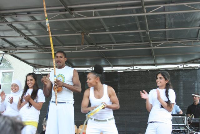 Auf der Bühne gab es ein buntes Programm von Chor- und Sologesang, Rap, Capoeira, Trommel- und Bläsergruppen, Tanz und Theater. Die Schulen des Reuterkiezes und wir, FUSION e.V., zeigten die künstlerischen Ergebnisse aus ihren Projekten und ihrer täglichen Arbeit zum Teil zum ersten Mal vor einem großen Publikum. Sehr professionell und kurzweilig führten die Schülerinnen der 1. Gemeinschaftsschule Berlin: Tiana El-Taki (Grundstufe) und Rozan El-Mustafa (Oberstufe) sowie der Lehrer Holger Vierke von der Elbe-Schule durch den Nachmittag.